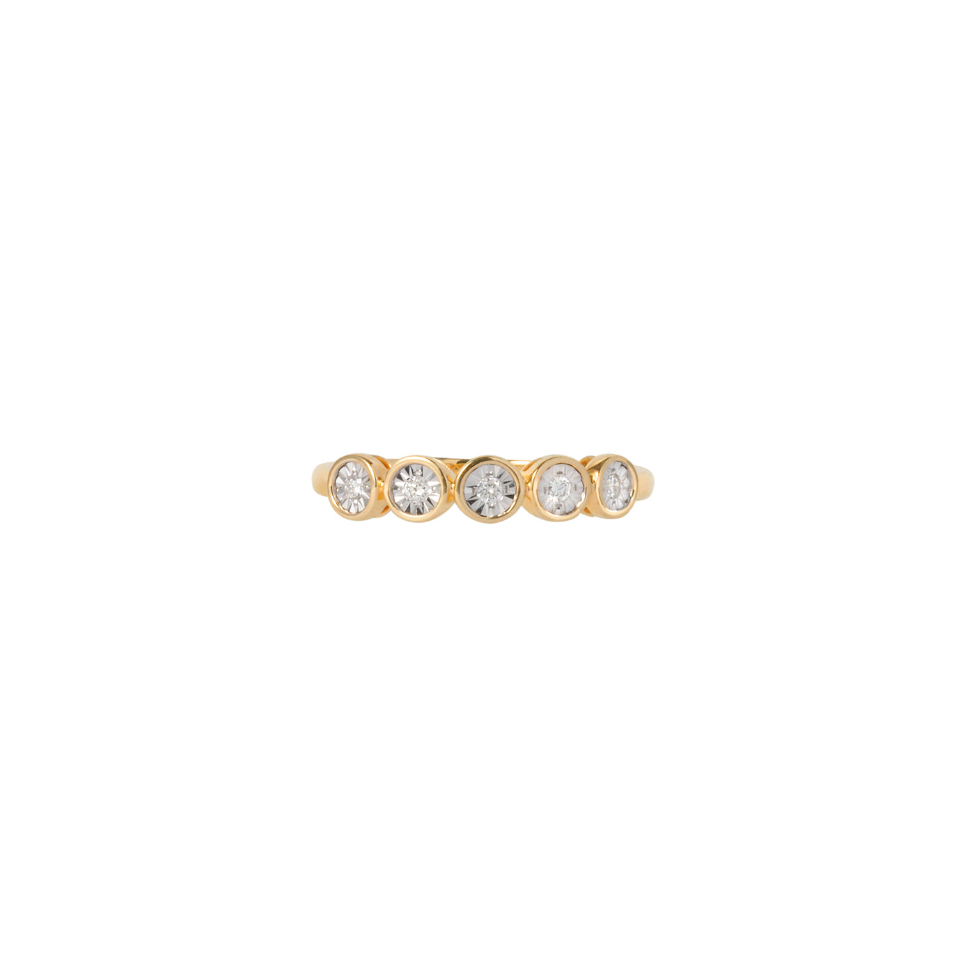 - Oprawa: pięć diamentów osadzonych ręcznie w charakterystycznych, gładkich,