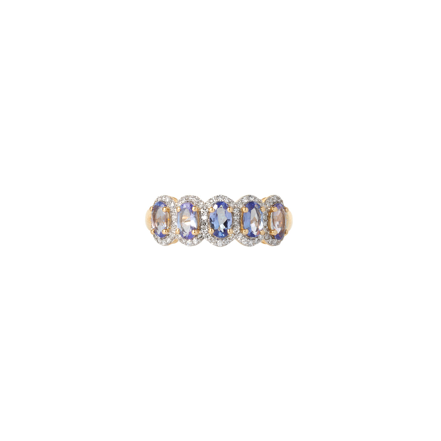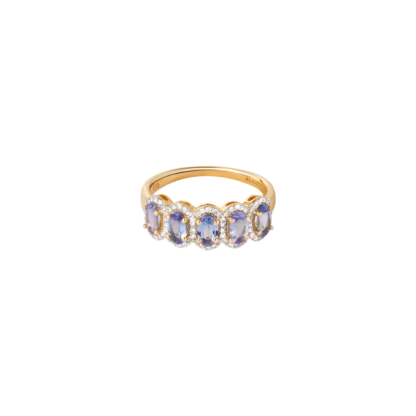 Éclat Blue Tanzanite Ring to pierścionek, w którym kolor odgrywa pierwszoplanową rolę. Owalne, naturalne tanzanity w chłodnym odcieniu błękitu zostały precyzyjnie oprawione w 14-karatowe złoto, a ich barwa zyskuje głębię dzięki subtelnemu diamentowemu halo.