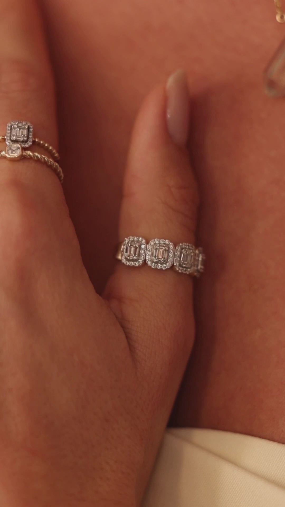 Każdy egzemplarz powstaje ręcznie z 14-karatowego złota, gdzie jubiler z najwyższą precyzją kształtuje obrączkę, dobiera proporcje kamieni i tworzy oprawę, która pozwala światłu swobodnie krążyć między diamentami.